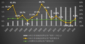 在歷經(jīng)10年的投資高速增長后,市政公用設施建設大體完成,2012年之后投資開始進入穩(wěn)定增長通道,近幾年的投資額基本穩(wěn)定在2萬億左右,占同期全社會固定資產(chǎn)投資總額的比例持續(xù)下降。2016年全國市政公用設施建設固定資產(chǎn)投資總額為2.1萬億元,占同期全社會固定資產(chǎn)投資總額的3.4%。